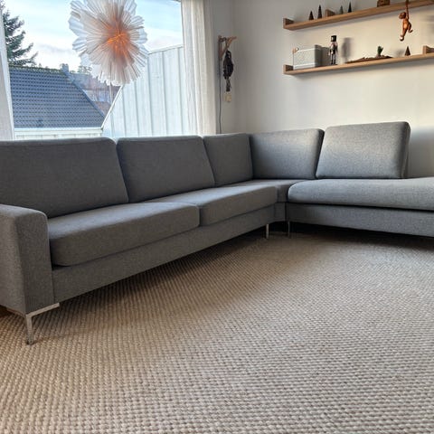Sofa kjøpt på bohus for ca. 18000 kr i 2019. Grå sofa med sjeselong på høyre side, det er også oppbevaring under sjeselongen. Trekket på putene kan tas av og vaskes i vaskemaskin.