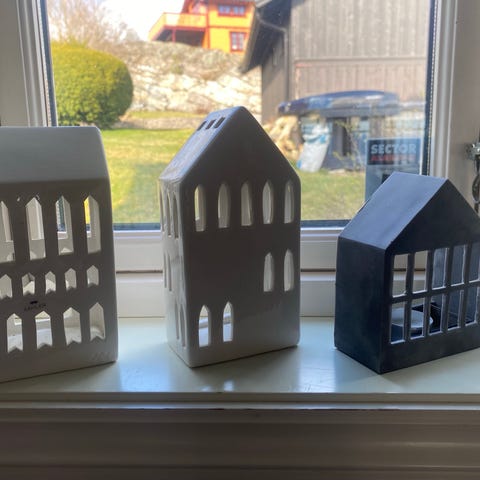 Husene lages i 3 og 4 mm glass. Det følger med en lyslenke til hvert hus. Disse husene er ikke laget for Telys.