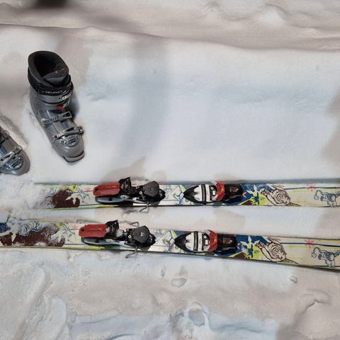 Pent brukte Stuf twintip ski med Marker 4.5 bindinger. Den ene bakbindingen er litt nyere enn den andre da den ble byttet ut.