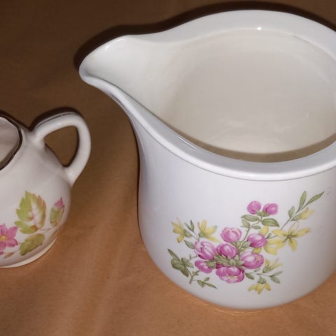 1) H 16 1/2 cm og diameter på toppen 8 cm, fra første halvdel av 1900-tallet, et lite, knapt synlig , skår under på siden, ellers ingen skader av noe slag. Pris: kr. 100,-.