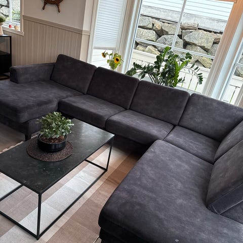 Det er med tungt hjerte eg har valgt å bytte ut denne deilige madame sofaen i svart velour. Har heva beina ved å sette på klosser for at den bedre skal gi bedre sittekomfort. Kjøpt i januar 2018, nypris er 5390,-