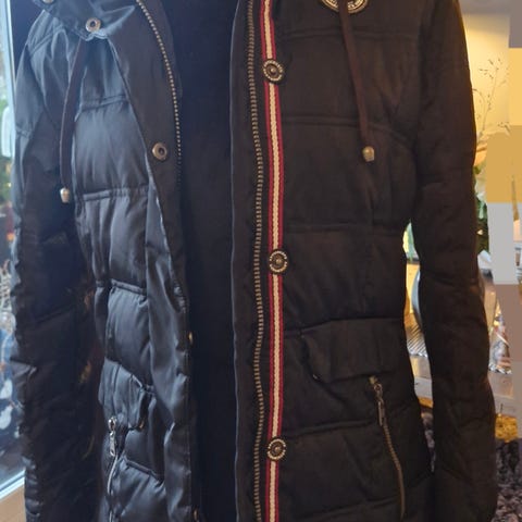 God høst- og vinterjakke til jente, størrelse 12-13 år. Vår jente har brukt den fra 9 til 11 år, hun er 162 cm nå. Hun har "bodd" i den - favoritt! Noe slitasje (se bilder), men fin og funksjonell. Avtagbar hette, glidelås og knapper, god i halsen.