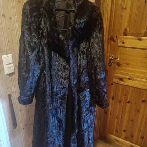 Eldre godt brukt lys grå/brun/beige pelskåpe. Noen steder er pelsen litt slitt, blant annet i front der den blir kneppet og i front venstre skulder/armhulen (se bilder). Det er også et lite hull i høyre lomme, men det kan jo repareres.