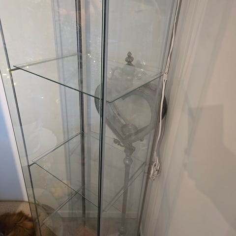 Uten inventar. Som det fremgår av bildene er det et skap med fem dører og hyller i alle rom som kan tas ut. Glasskapet har hyller av tre/glass. Tre skuffer på hver side.