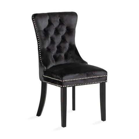 Lekker spisestuestol i tidløst design, med buet rygg med polstrede knapper i rygglene. Ryggen har en lekker ring, og fronten og sidene er pyntet med nagler. Trukket i herlig velour!