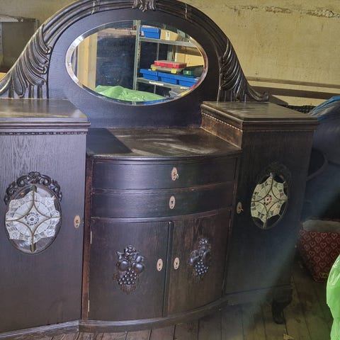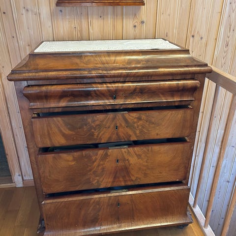 Gammel, arvet kommode selges. H:153, B:93, D:51. Usikker på alder, men den er ganske godt bevart og muligens antik. Nøkkel til skuffer har forsvunnet.