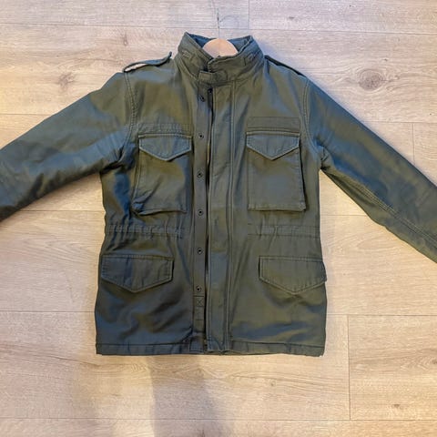Lite brukt jakke i fargen olivengrønn som er meget populær denne våren & sommeren, Med en rekke lommer og spennende detaljer. Hette i kragen. Glidelås i ermene. Passer godt på kjøligere kvelder om vår- & sommeren og i overgangen til høsten. Klaffer på skuldrene. Str. 46. (S / M)