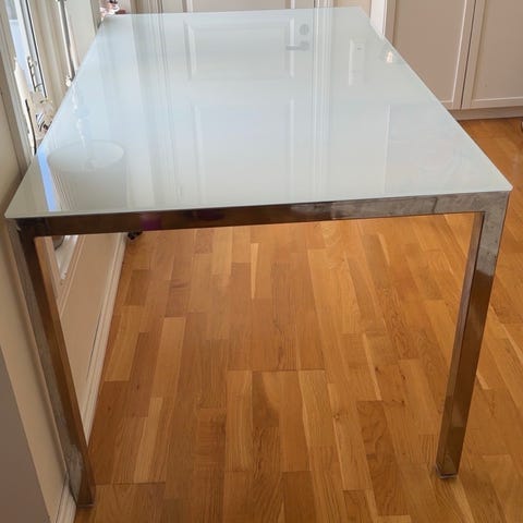 Selger glass/stål bord. Glasset er hvit frostet og understellet i krom stål.