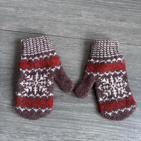 Helt nye hjemmestrikket ullvotter( ca 2-4år) selges hbo 100kr Sender gjerne med PostNord 69kr eller fiksferdig.