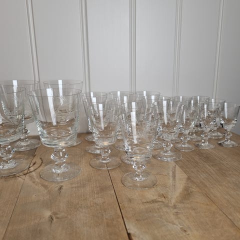 9 stk glass som er kopi av 1700-talls glass. Det er trolig laget på 1950-60 tallet eller 30tallet. Det ser ut som rennende glass, og flere av glassene har bobler i seg. Har hatt glassene på BLOM, og det er kopi av 1700 talls glass. Har sjekket produktkatalogen til Hadeland for år tilbake, og er ikke sikker på om dette er Hadeland. Jeg hadde også snaps glass i samme. Da kom det en herremann og formidlet at han mente dette var Magnor glass fra 50 tallet og han kjøpte snaps glassene. Det er skår i stett på et glass. Selger alle for 350 kr eller bud.