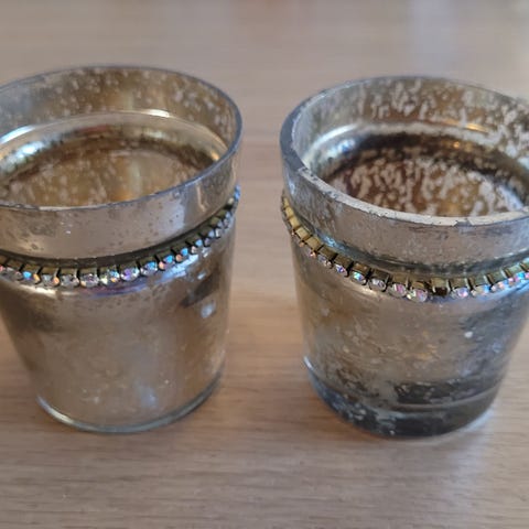 10 stk. fat til glass og en skål i samme serie selges, helst samlet. Sølvfarget med gullfarget kant ytterst. Diameter på fat: 10,5 cm. Indre diameter: 7 cm. Diameter på skål: 14 cm. Skålens høyde: 2,5 cm.