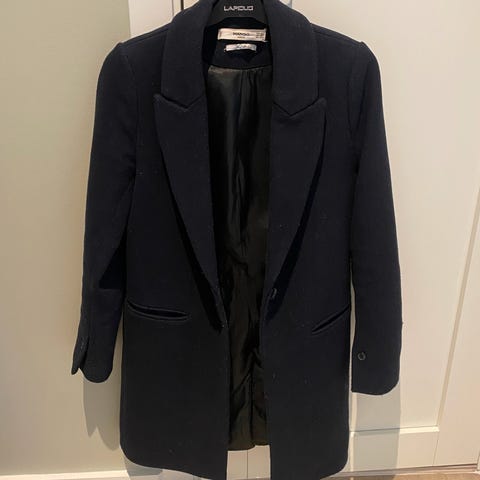 Mørkeblå kåpe fra Mango str. XS. Brukt én gang, så er så god som helt ny. På noen av bildene ser den sort ut pga. lyset, men den er altså mørkeblå. Jeg har lik i grå og bruker den masse, synes den er god og varm og veldig behagelig på.😊 Nypris var 799,-