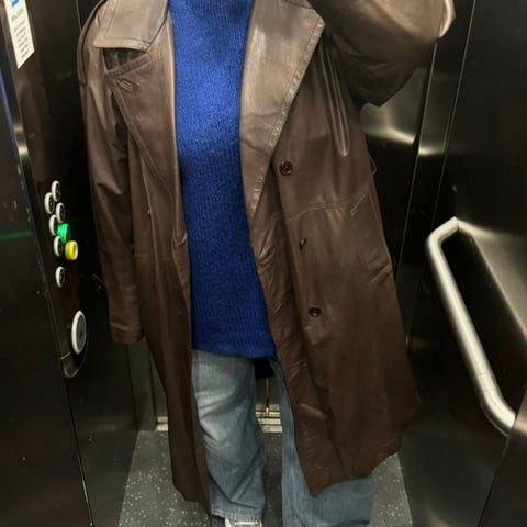 Svart jakke/kåper fra H&M, belte, gulfarget beslag på enden av beltet og på arm-spenner. Flott snitt. Brukt 2 ganger. Med tynt for, ikke kåpe for å holde varmen, men penkåpe. Kjøper betaler porto