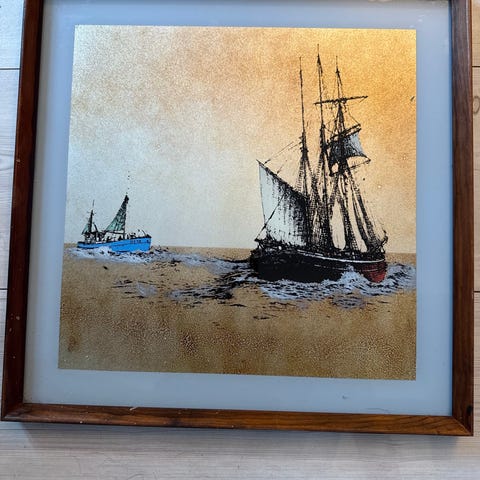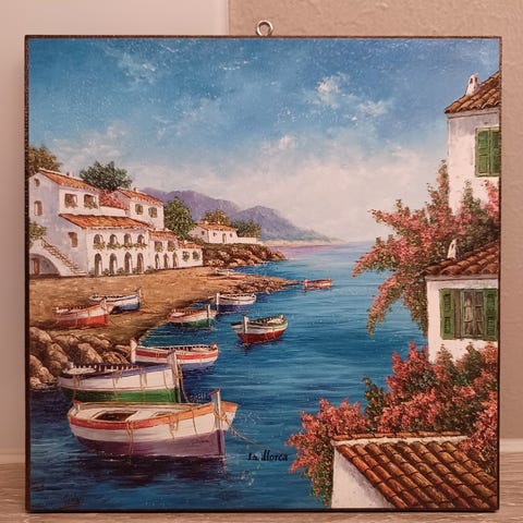 Lite bilde malt på treplate av avdøde Olav Johannessen fra Lofoten. Kan sendes med Posten Norge