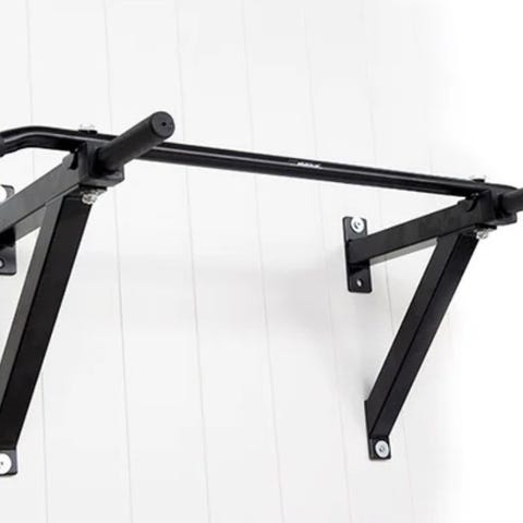 Dette veggmonterte treningsapparatet med to stenger er utstyrt med en lat pull-down stang og en lav pull-up stang som lar deg trene alle store muskelgruppene i kroppen.