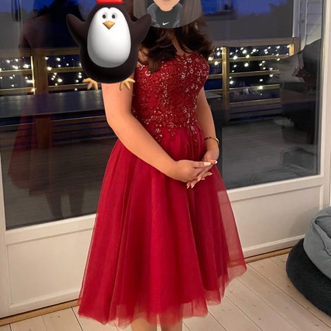 Pen brukt ballkjole brukt 1 gang, ingen slitasje. Sko og underskjørt følger med, størrelse 9. På grunn av knyting bak, gjør dette at kjolen vil kunne passe XS - M. Alt er kjøpt på MyBella i Oslo.