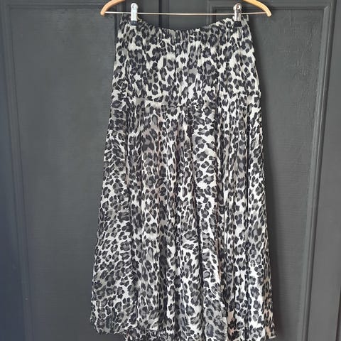Ankellang vintage skjørt med gråblått slangemønster fra Monte Verde i størrelse 34. Lengde er 90 cm, livvidde 72 cm. Kjempefin glans i stoffet og folder som gir fin vidde. Pent brukt, ingen flekker eller skader.
