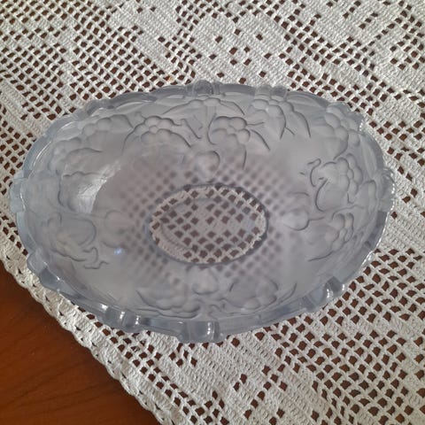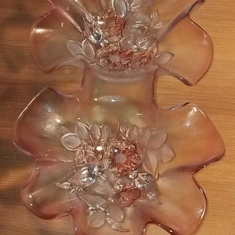 Mikasa Walther Glass Vintage Rosella Mønster, rund Skålen er laget av tungt glass med en frostet kant av frostet glass. Kanten av skålen er klart glass med omvendte 3D rosa roseknopper og klare frostede blader og stilker. Kanten på tallerkenen er frostet glass med en rosa fargetone. Walther Glass-design fra Tyskland.