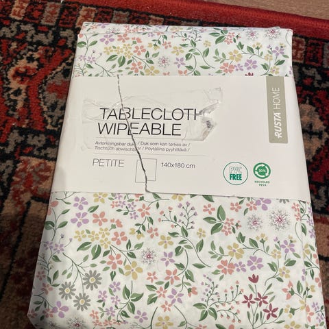 Mål ca 76x76 cm.Heklet av Nylån trå.Trenger ikke stryke etter vask.