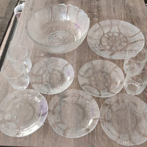 To glass, en mugge og en bolle i glass fra Frankrike. Mugga er 21 cm høy, to glass er 18 cm høye. Og bollen har en høyde 10 cm og en diameter på 23 cm. Pressglass. Merket France.