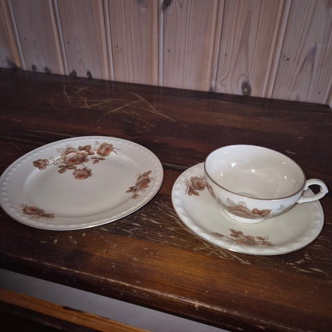 4 kopp / 7 cm høy + 2 tallerken. 100 kr sammen. J&G Meakin. England