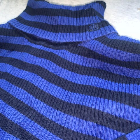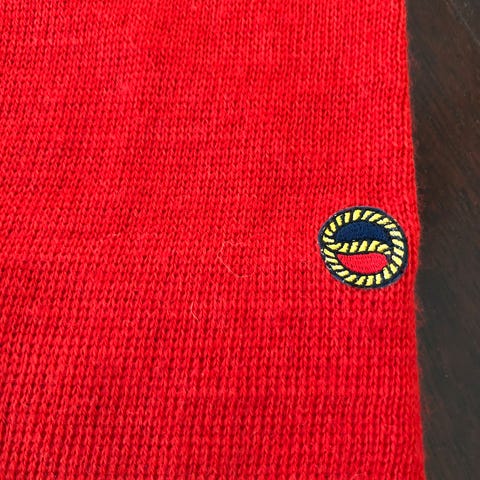 Perfekt vårlue i bomull. Kul mørkeblå beanie med rød og hvit stripe, passer utmerket som kult tilbehør.