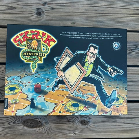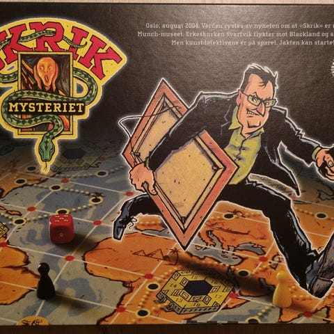 Skrik-mysteriet er et morsomt og hektisk.forfølgelsesspill.for hele familien som bygger på Bjørn Sortlands populære bøker om Kunstdetektivene. Handling: Verden rystes av nyheten om at maleriet Skrik er ranet fra Munch-museet. Erkeskurken Stig Svartvik flykter mot Blackland. Skurken må fanges og bringes i fengsel. For 2-6 spillere fra 6 år. Krever ingen kunnskaper om kunst.
