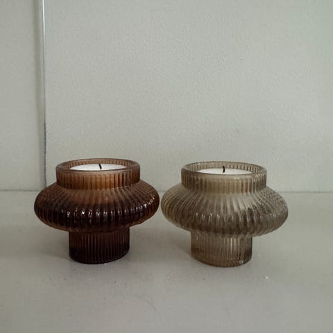 Nye og ubrukte lysestaker fra H&M Home i kobberfarget metall, selges til 50kr per stykk eller 150kr for alle fire sammen.