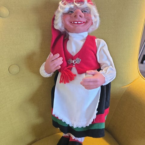Nydelig nisse 68 cm høy, med fletter, sløyfer, nisselue, bluse, kjole med hjerte, heklet sjal, bunadsnapper og forkle. Flott håndarbeid. Holder en grøt skje i tre i hånden. Kan sendes med postnord, sporbar pakke til 69kr, eller bruk fiks ferdig. Selger en nissedame til, som er i omtrent samme størrelse, i en annen kjole / bunad.