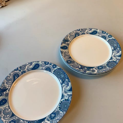 11 kopper,12 skåler 13,5 cm,11 asjetter 19 cm,fløtemugge og sukkerskål. En skål med lite nagg.