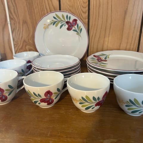 Det er 38 deler. Det er litt flekkvis bruksslitasje i mønster på skåler.
