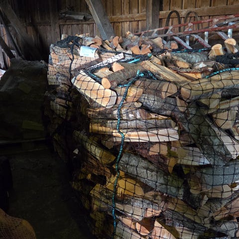Har tørr bjørkeved i 1000 liters sekk til salgs. Veden er stablet i pallen. Lagret innendørs.