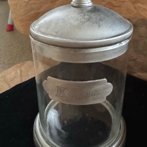 Retro kaffeglass i hvitt med rødt mønster selges. Ca. 15, 5 cm høyt.