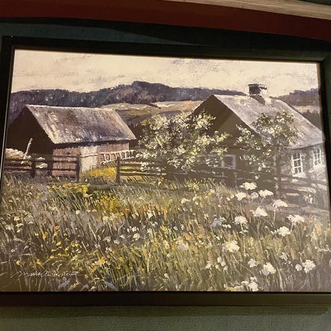 Innrammet i en hvit - og gullfarget treramme med yttermål 75 x 61 cm. Lysmål er 62 x 48 cm.