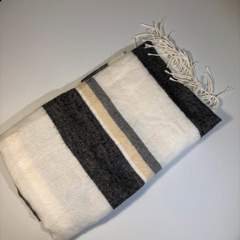 Varmt og deilig skjerf i mørkebrunt og grått med hvite striper selges billig. Brukt bare en gang.
