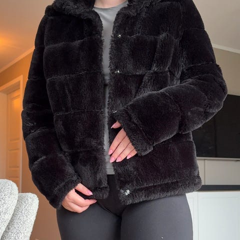 Nydelig jakke - kan brukes på begge sider. Pels på den ene siden og boblestoff på den andre siden. Ikke brukt. Svart.