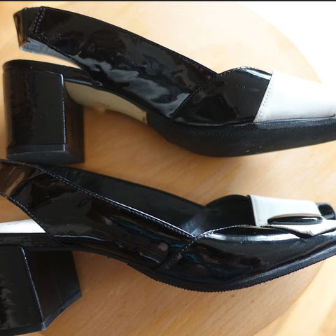 Pent brukte kile heler. Har stropp rundt ankelen med muligehter for å stramme/slakke skoen.