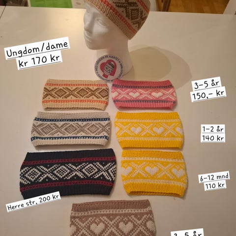 Beige og brun er i 100% ull, og koster 120,- per stk. Svart er strikket i akrylgarn, og selges for 50,-. Pakkepris ved kjøp av flere.
