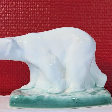 Stor isbjørn i porselen. Ingen stempler, men tror det er Porsgrunds Porselen, da de har en som er veldig lik i glasuren. Den har et lite hakk på venstre øret, synlig på bilde nr 3.