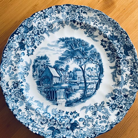 Ovalt fat fra Arabia blått hvitt. Ca 36x25 cm. Helt og pent, ingen skår. Et par merker i glasuren på undersiden se bilde.