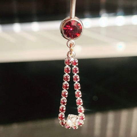 Supersøt navlepiercing i blomsterfasong med kuleanheng. Piercingen er dekket med rødt glitter, superfresh på stranden. Den er aldri brukt. Jeg sender stort sett alltid første virkedag etter mottatt penger for frakt :)