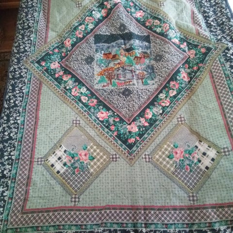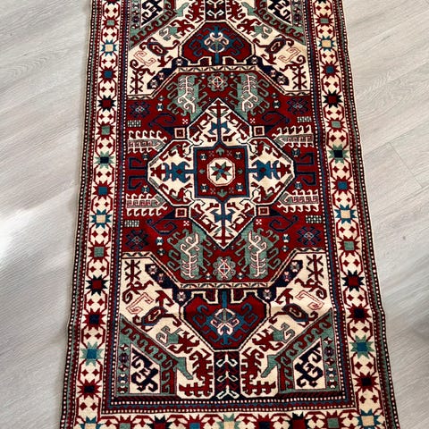Dekorativt teppe med hemper til oppheng på baksiden til vegg...eller brukes som duk eller gulvteppe. Teppe har kun ligget i skap og ikke vært i bruk.