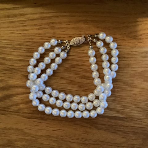 Superfint perlearmbånd i fire deler som kan brukes sammen eller hver for seg. Armbåndene er gullfarget. To perlearmånd og ett chainsarmbånd, mens det siste er et enkelt strassarmbånd. Superfine sammen! Armbåndene er kun brukt en gang. Jeg sender stort sett alltid første virkedag etter mottatt penger for frakt :)