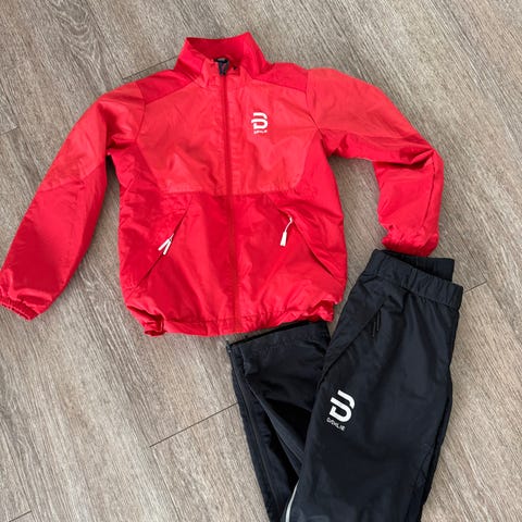 2 delt skidress. Rød jakke i str 130, blå bukse i str 120. Kr 150 per del. Må hentes