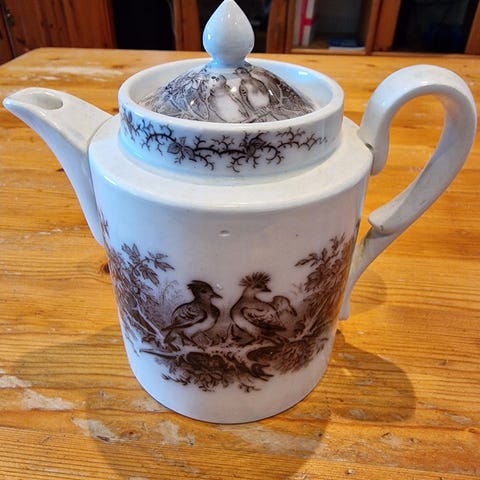 Te-Kaffe mugge /porselen Meget pen. Garndner Factory Verbliki, Russland.. : se merke Høyde: 20 cm bredde inkl.tut/hank 29 cm. sannsynligvis fra 60/70-tallet. 400,- NB. Sender med posten.