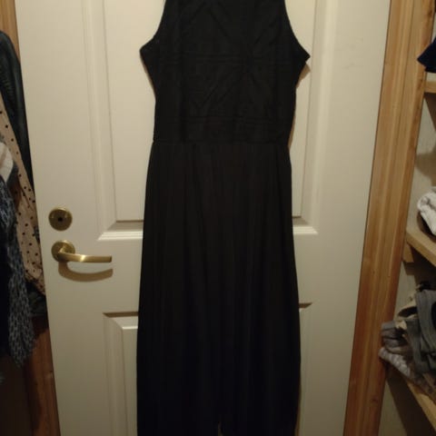 Sort kjole som passer til selskap og fest. Fine detaljer i stoff og fjær nederst. Pose til å oppbevare kjolen i følger også med.