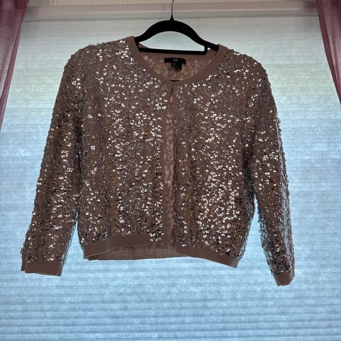 Mauve-farget cardigan fra merket Saint Tropez. Pent brukt få ganger, men en av paljettene bak er litt løs og metallfargen er borte noen steder.