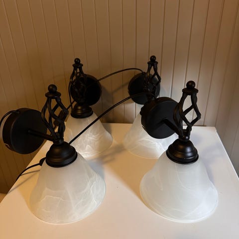 Selger 4 stk vegglamper i antikkhvit farge. Lampene er kun brukt inne men kan også brukes ute. Selges for 100,- pr.stk.