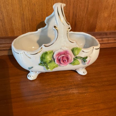 To gamle potteskjulere eller boller til blomsteroppsatser. Den runde kan henges opp. Den har roser på tre sider. Den avlange har kun roser foran. Det er gått litt hakk og skall av rosene her og der, men det synes ikke så godt. Den runde er litt misfarget i porselenet på innsiden. Jeg har også en tredje potteskuler som kan følge med på kjøpet, da rosen på denne er ganske ødelagt. Diameter rund bolle 20,5 cm. Lenge avlang 23 cm. Selges for kr 200,- samlet.