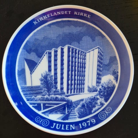 Selger en tallerken fra 100 års jubileumet. 1880-1980